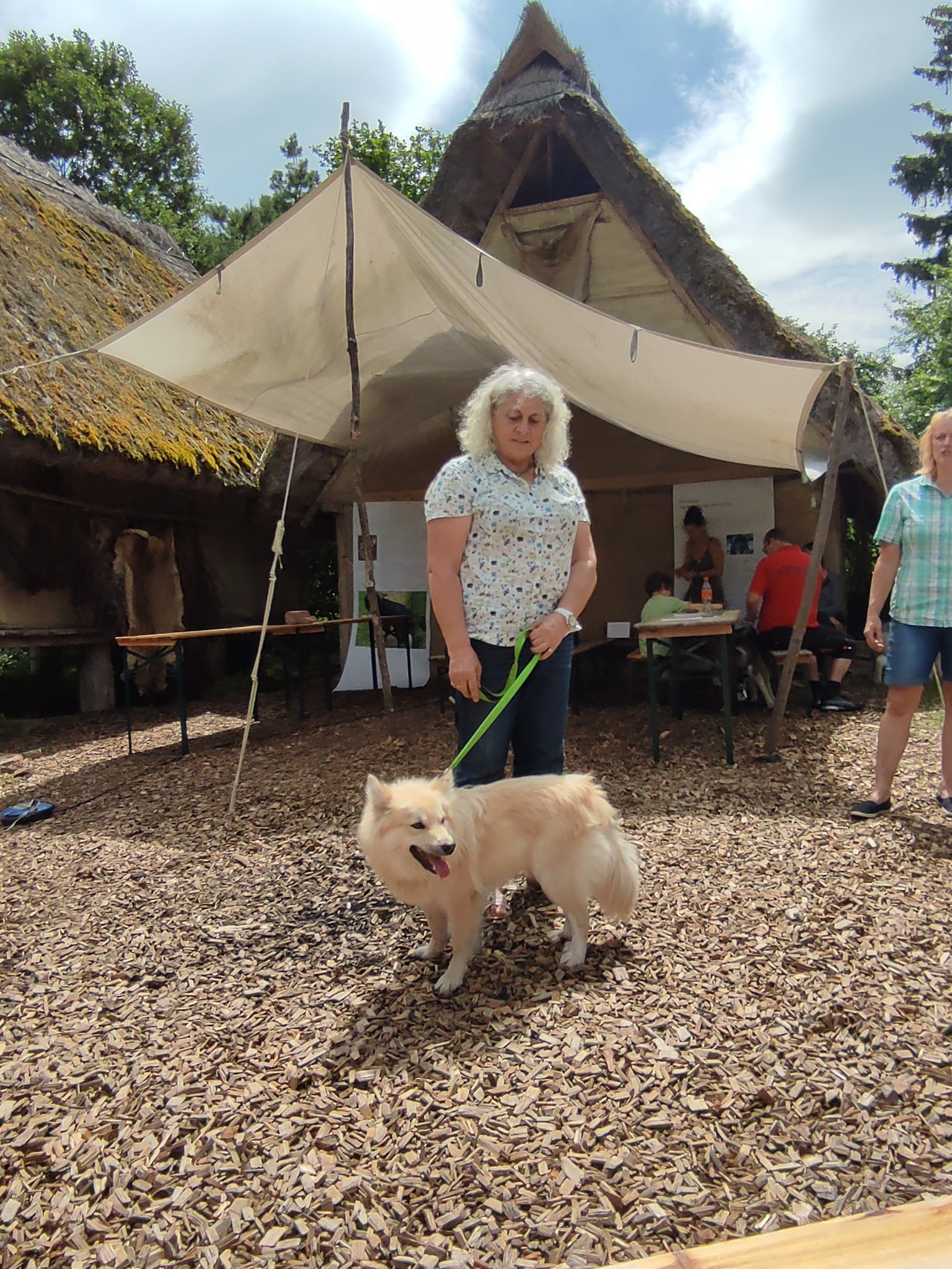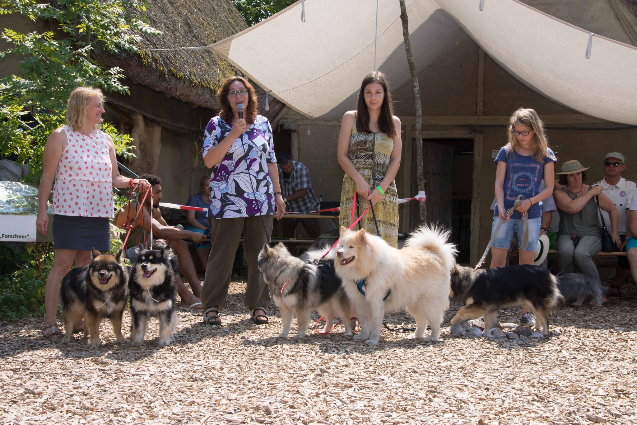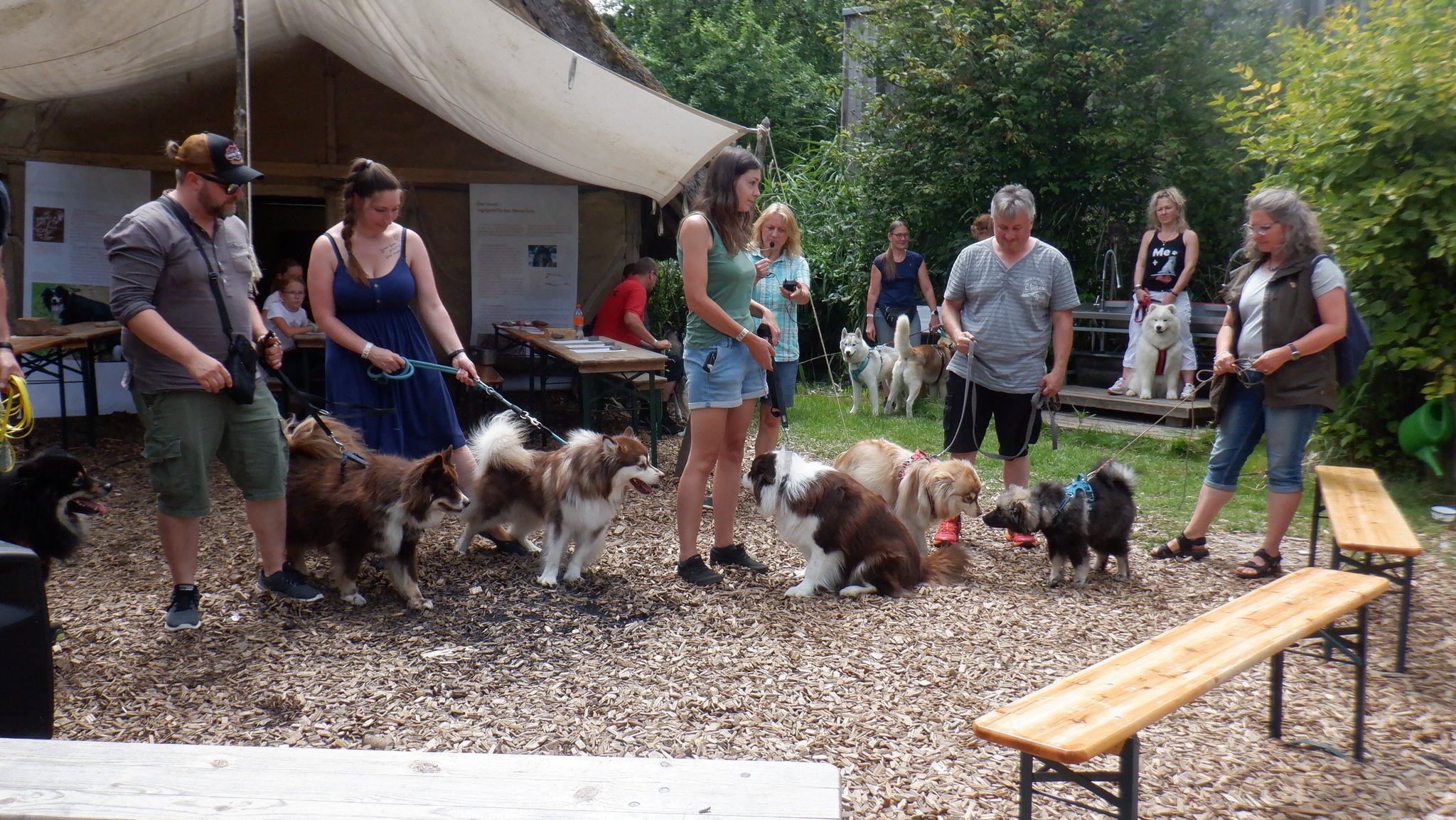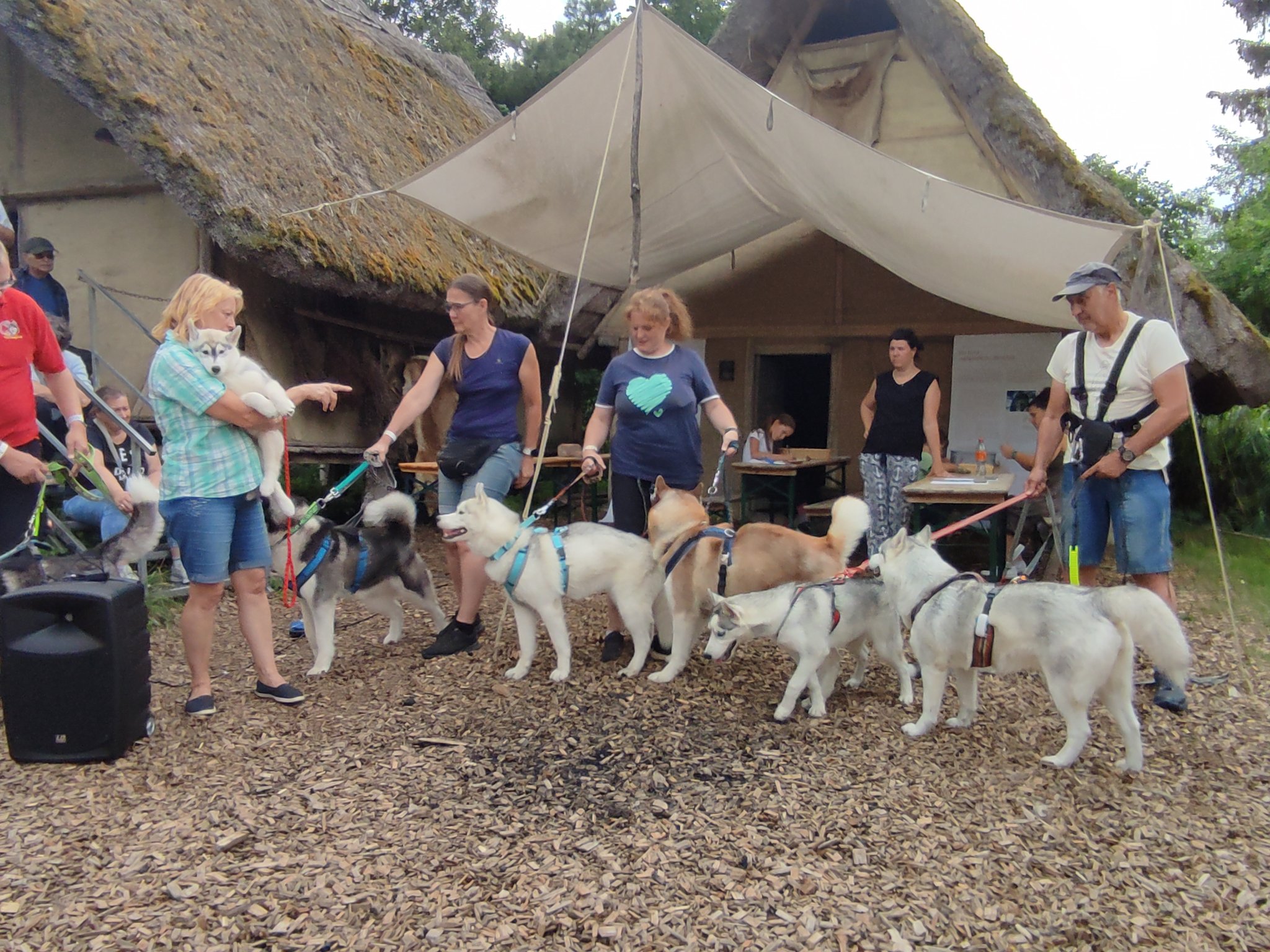 Da sich unsere Nordischen am besten für solche Zwecke eignen, hatten wir das Vergnügen an einem schattigen Platz, inmitten von nach gebauten, steinzeitlichen Häusern, unseren Infostand auf zubauen und unsere nordischen Hunde zu präsentieren.