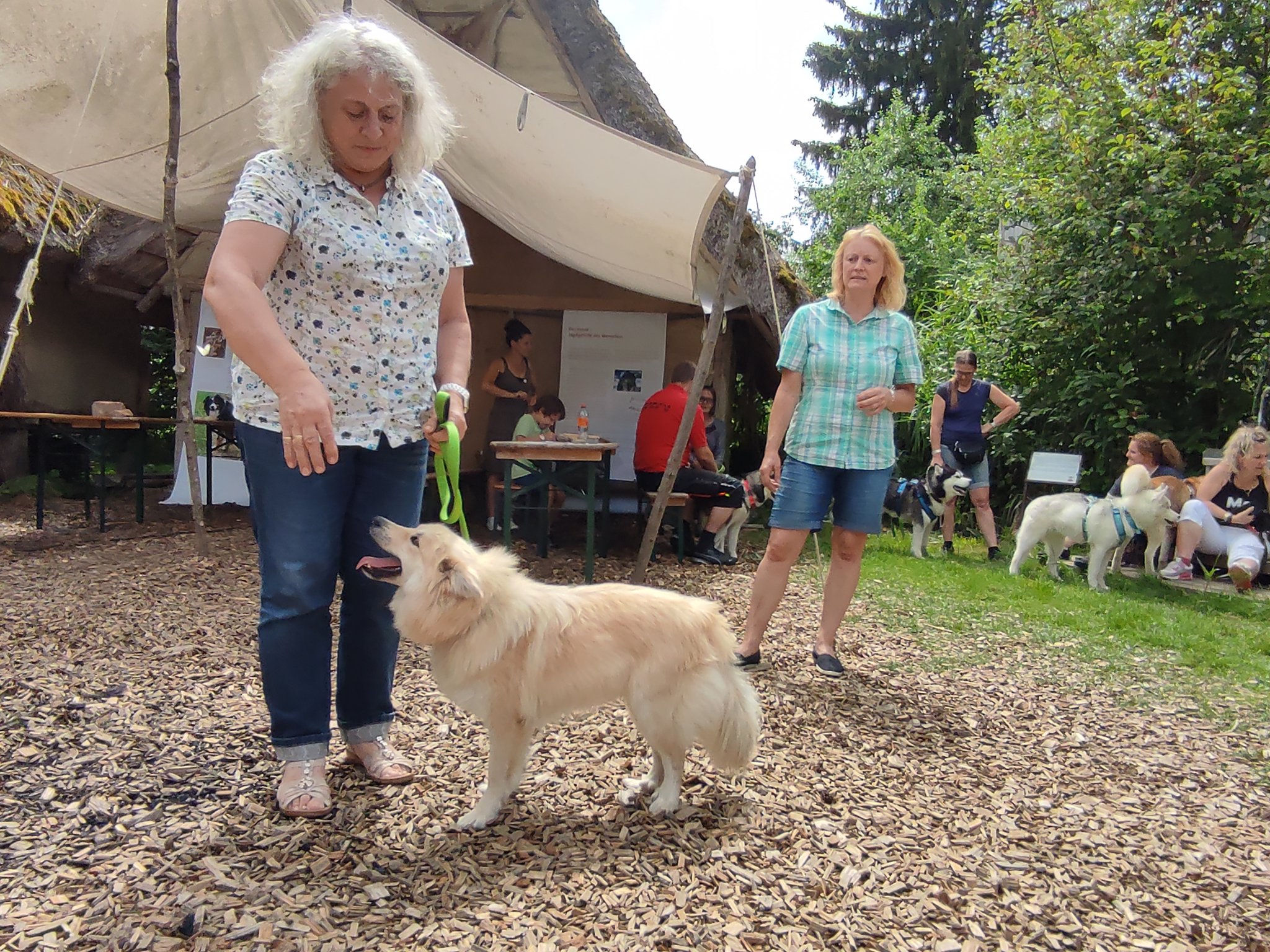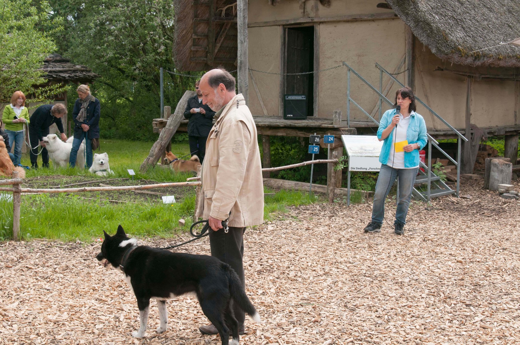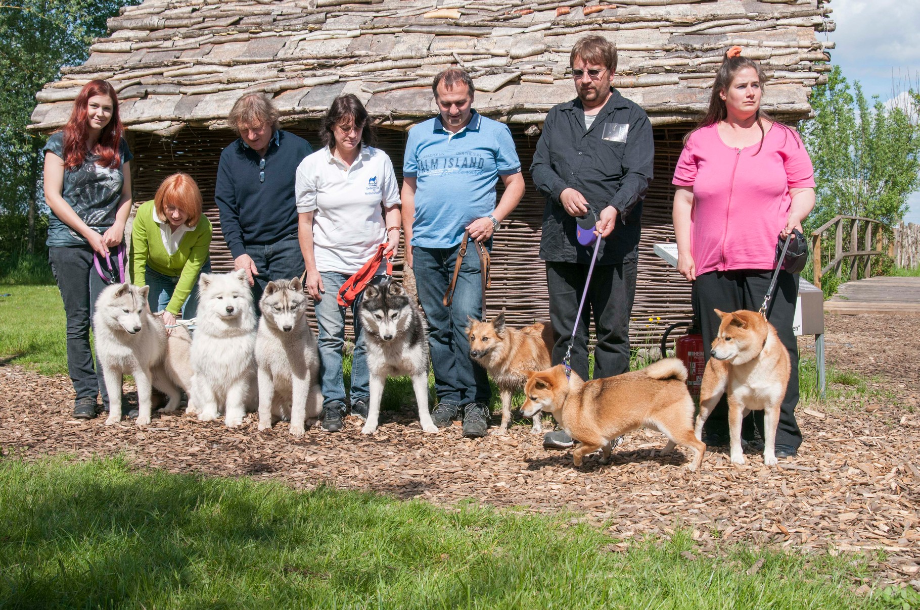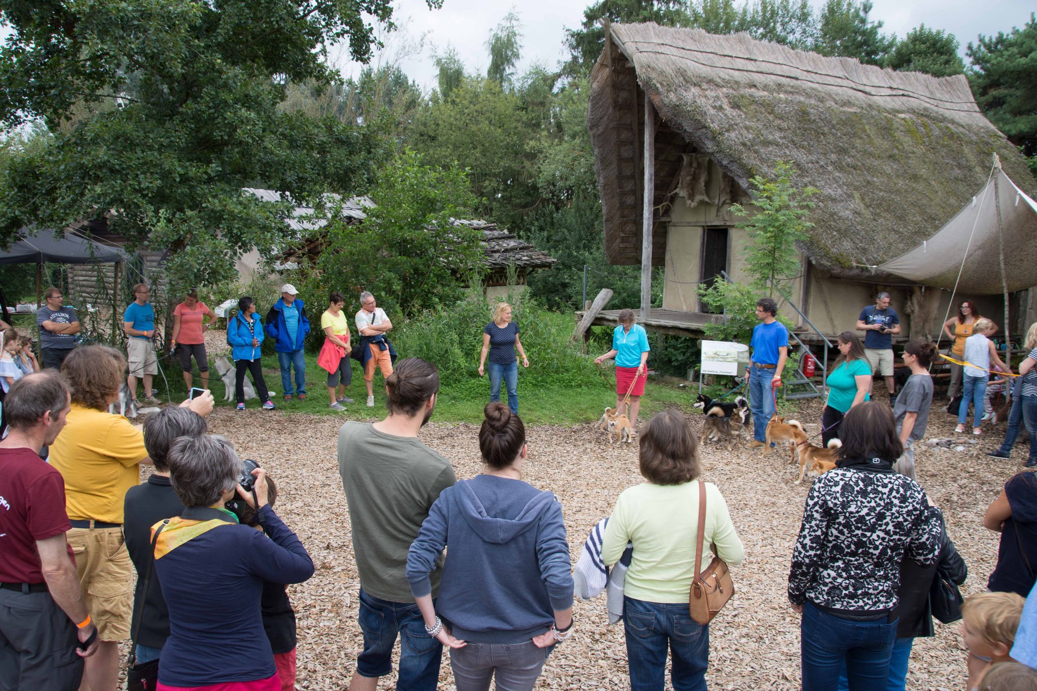 Da sich unsere Nordischen am besten für solche Zwecke eignen, hatten wir das Vergnügen an einem schattigen Platz, inmitten von nach gebauten, steinzeitlichen Häusern, unseren Infostand auf zubauen und unsere nordischen Hunde zu präsentieren.