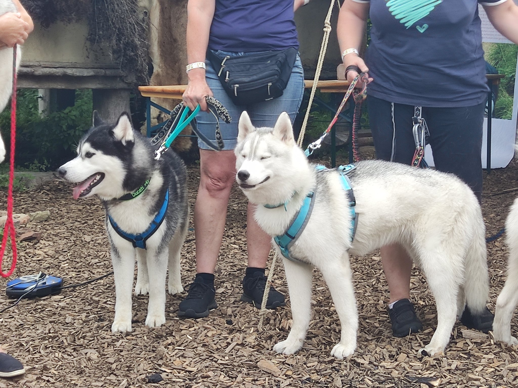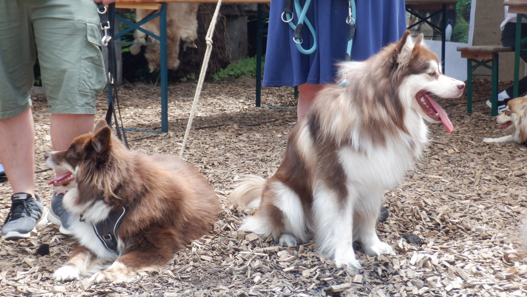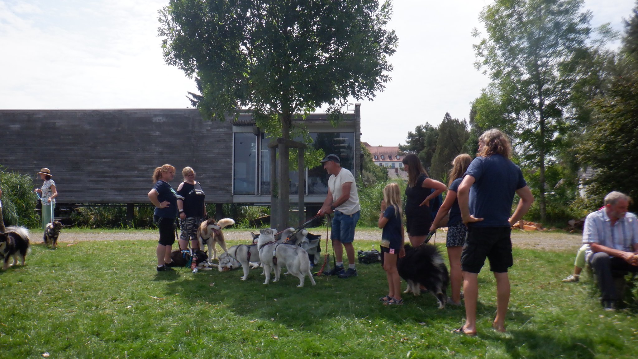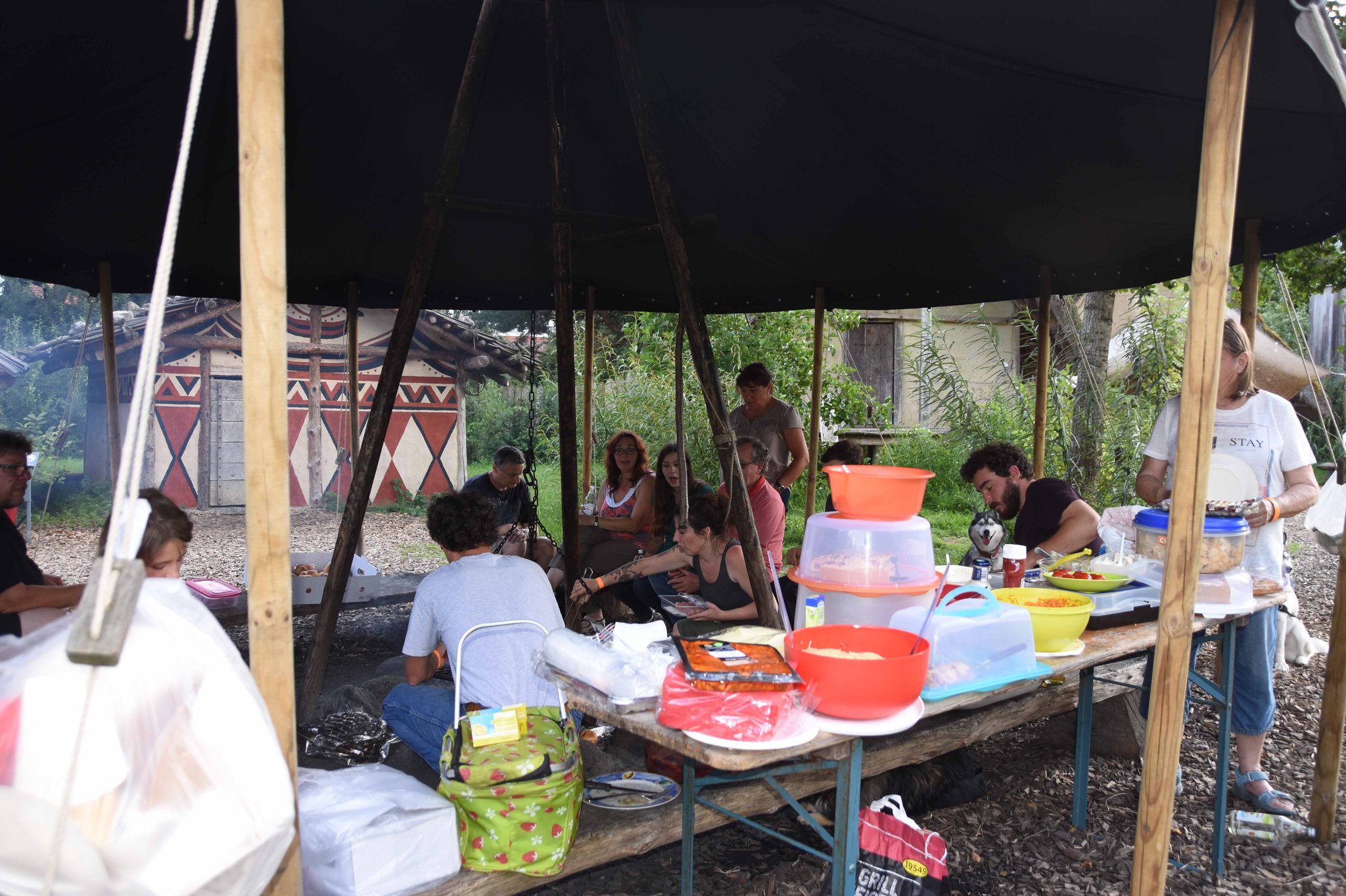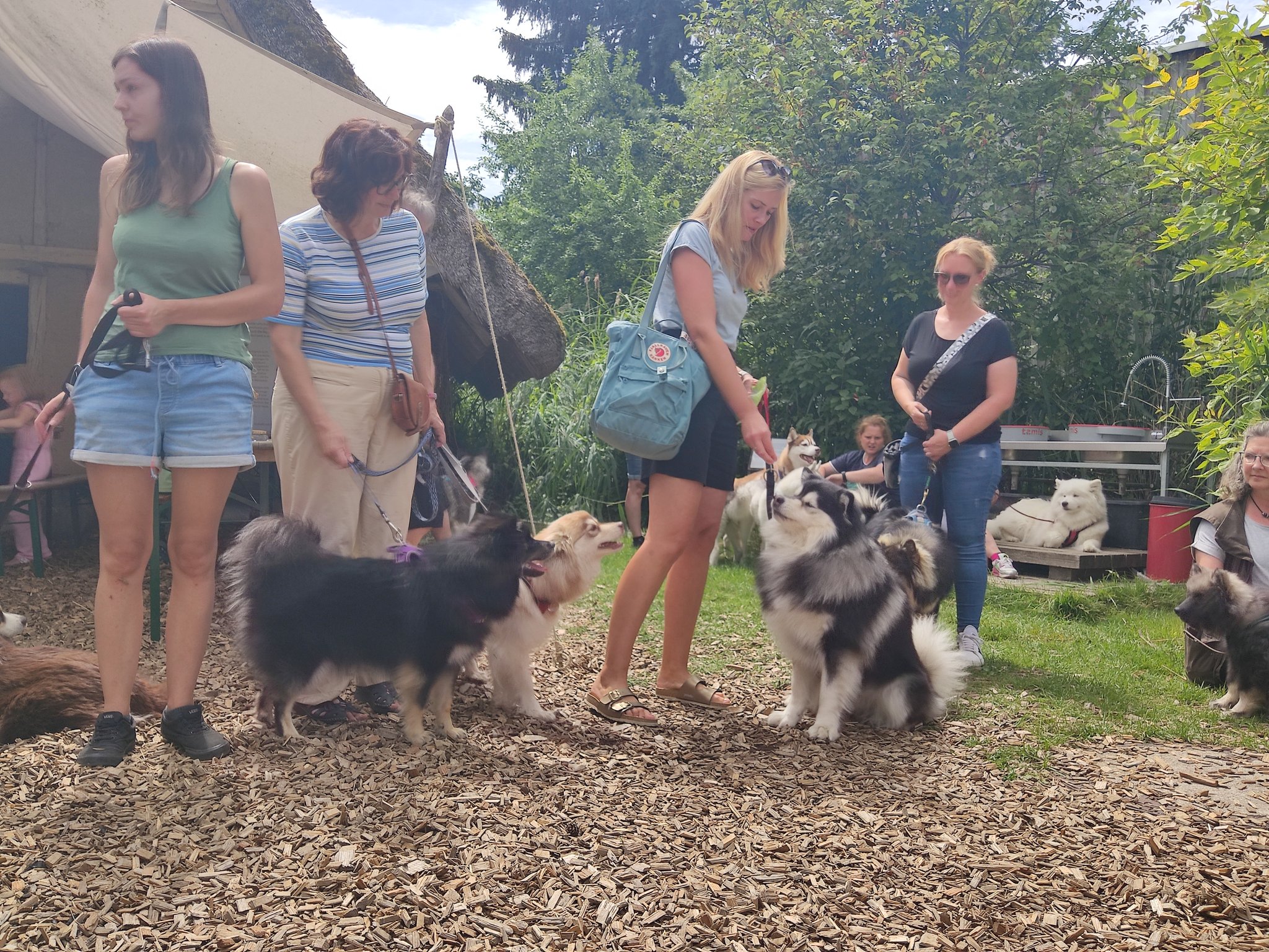 Da sich unsere Nordischen am besten für solche Zwecke eignen, hatten wir das Vergnügen an einem schattigen Platz, inmitten von nach gebauten, steinzeitlichen Häusern, unseren Infostand auf zubauen und unsere nordischen Hunde zu präsentieren.